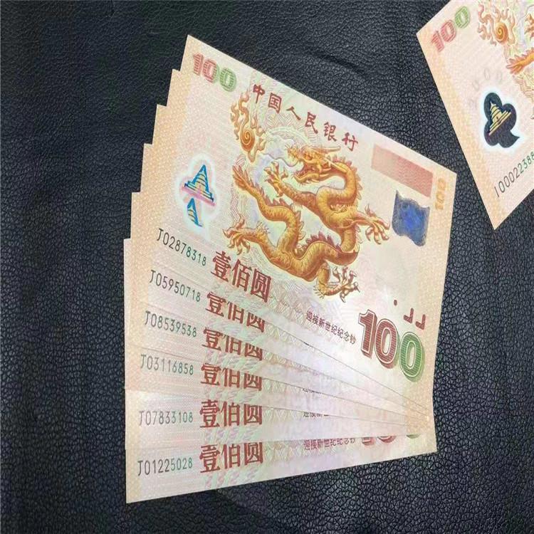 2000年世纪龙钞,发行于2000年11月28日,中国人民银行为“迎接新世纪”而发行的一套塑料材质纪念钞,面值100元,票面尺寸为165*80mm,发行量1000万,主色为橘色,正面主景以北京九龙壁为设计依据,“龙”的左侧为“火珠”吉祥图案,票面左侧透明视窗为“天坛”图案,右侧为动态全息标志。背面主景为迎接新世纪的代表性建筑──中华世纪坛,上方为中国传统“飞天”图案和“中国人民银行”汉语拼音,右上方为中华人民共和国国徽图案,右下方为蒙、藏、维、壮四种民族文字的“中国人民银行”字样和面额。