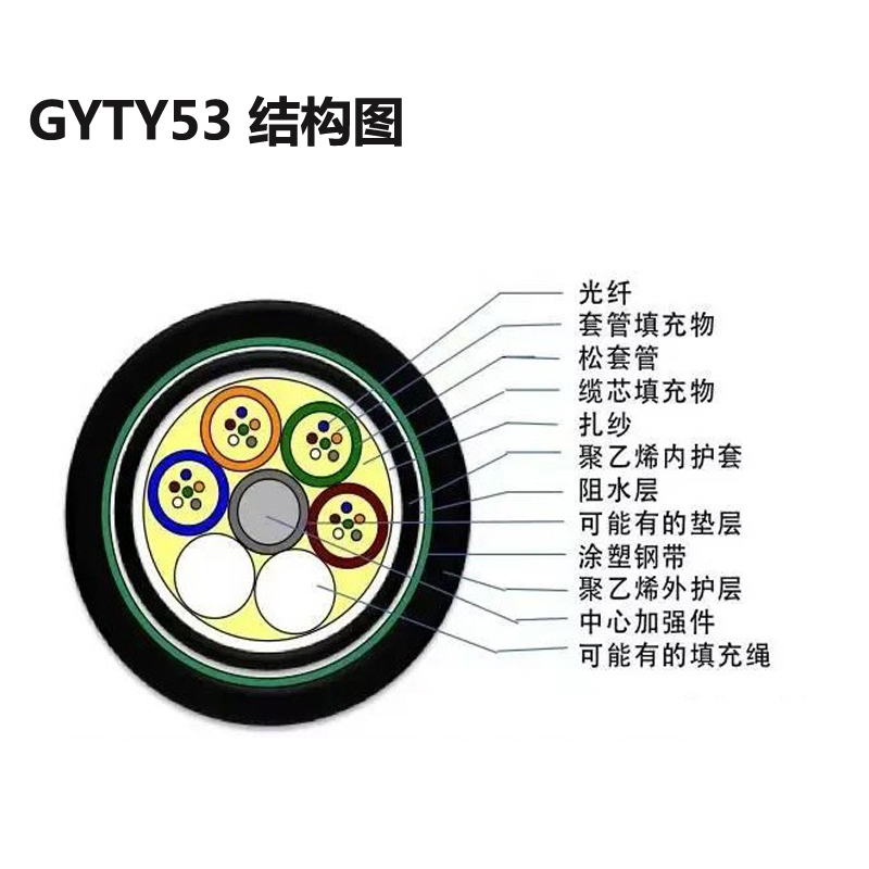 GYTY53 光缆的结构是将 250µm 光纤套入高模量材料制成的松套管中,松套管内填充防水化合物。缆芯的中心是一根金属加强芯,对于某些芯数的光缆来说,金属加强芯外还需挤上一层聚乙烯(PE)。松套管(和填充绳)围绕中心加强芯绞合成紧凑和圆形的缆芯,缆芯内的缝隙充以阻水填充物。缆芯外挤上一层聚乙烯内护套,双面涂塑钢带(PSP)纵包后挤制聚乙烯护套成缆。
