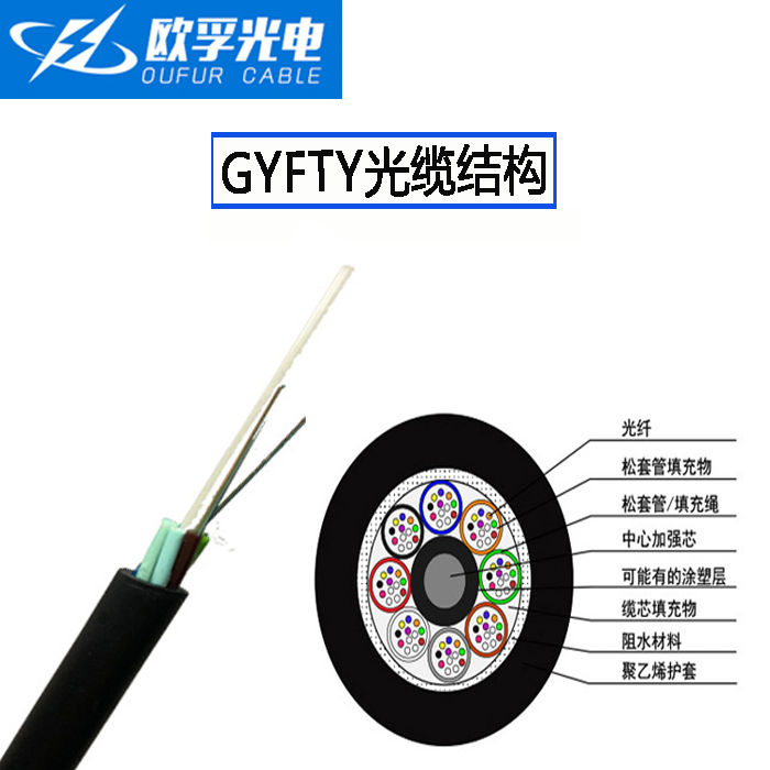 GYFTY光缆的结构是将250μm光纤套入高模量材料制成的松套管中,松套管内填充防水化合物。缆芯的中心是一根玻璃纤维增强塑料(FRP),松套管(和填充绳)围绕中心加强芯绞合成紧凑和圆形的缆芯,缆芯内的缝隙充以阻水填充物。缆芯外挤上一层聚乙烯护套成缆。