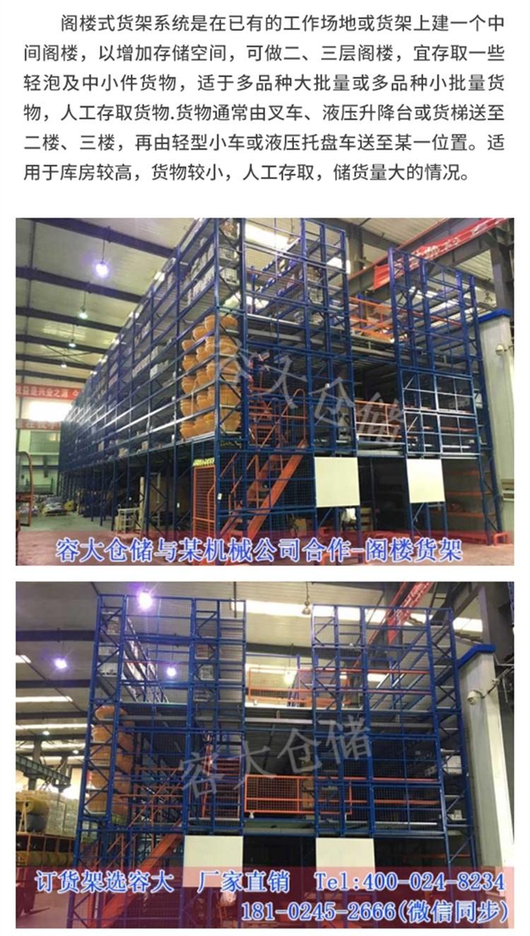 阁楼式货架系统是在已有的工作场地或货架上建一个中间阁楼,以增加存储空间,可做二、三层阁楼,宜存取一些轻泡及中小件货物,适于多品种大批量或多品种小批量货物,人工存取货物.货物通常由叉车、液压升降台或货梯送至二楼、三楼,再由轻型小车或液压托盘车送至某一位置。适用于库房较高,货物较小,人工存取,储货量大的情况。