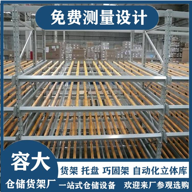 流利式货架是一种轻型的先进先出式货架,货物从货架的背后放入,前面取出,它一般同标准塑料周转箱或纸箱配合使用,空间利用率达50%,存储方式比较省力。一般在汽车、电子产品、超市配送中心等地方使用较多。