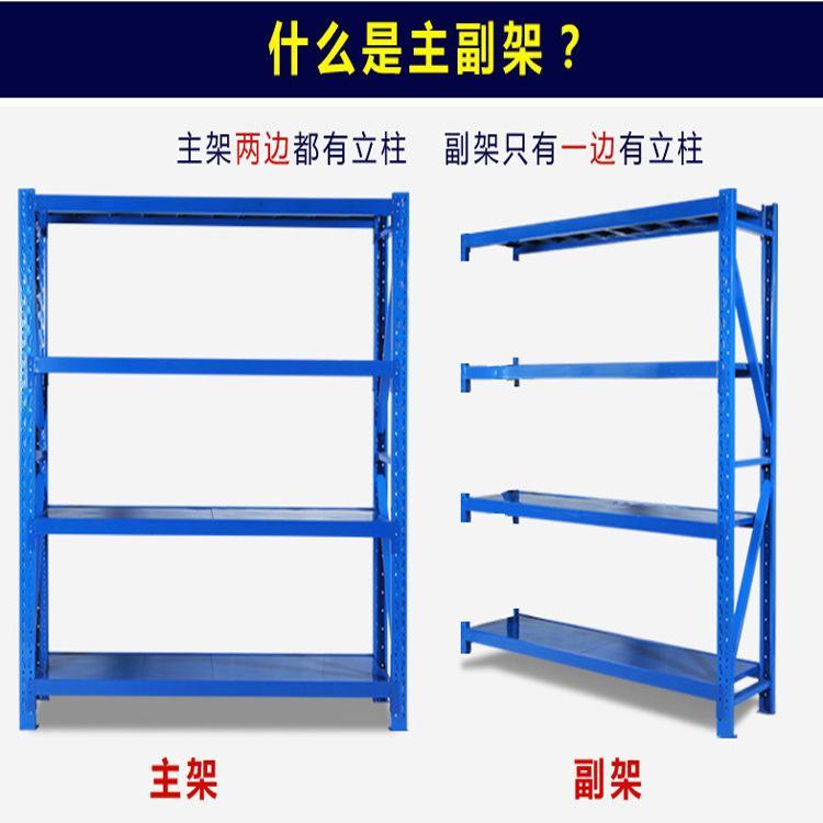 中型货架是由立柱,横梁,层板组装而成的,独立的一组有两片立柱,这样的货架叫做主架。如果把几组组装成为一列,那么除了需要两片立柱外,其他的可以和它前面的一组共用一片立柱,这样的货架叫做副架。