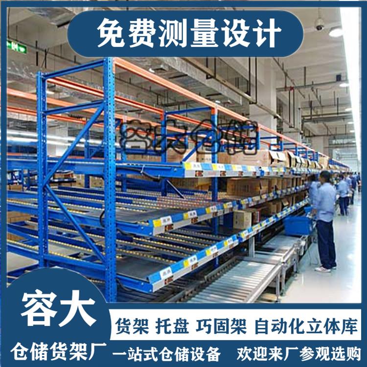 流利式货架是一种轻型的先进先出式货架,货物从货架的背后放入,前面取出,它一般同标准塑料周转箱或纸箱配合使用,空间利用率达50%,存储方式比较省力。一般在汽车、电子产品、超市配送中心等地方使用较多。