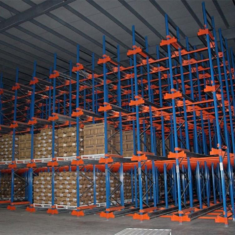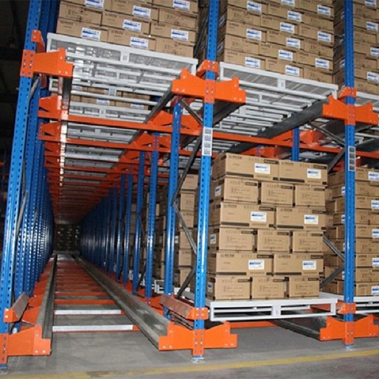 贯通式货架除了靠近通道的货位,由于叉车需要进入货架内部存取货物,通常单面取货建议不超过7个货位深度。为提高叉车运行速度,可根据实际需要选择配置导向轨道。在支撑导轨上,托盘按深度方向存放,一个紧接着一个,货物存取从货架同一侧进出,