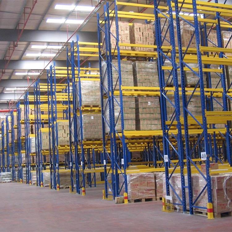 以立柱片+横梁形式的全组装结构,结构简明有效。每两组货架背靠背放置,每一列货架设计一条通道(通道的宽度视选用叉车而定)。货物存取便捷,利用率较高,适合多品种货物的大量存储