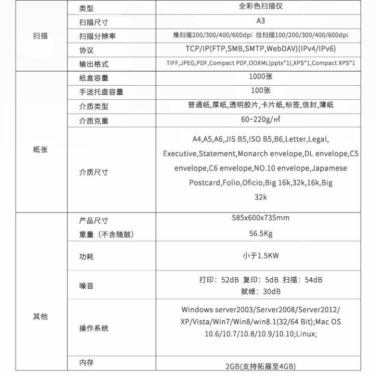 | 输出尺寸 | A3-A5 | 纸张容量 | 标配1100张 |
