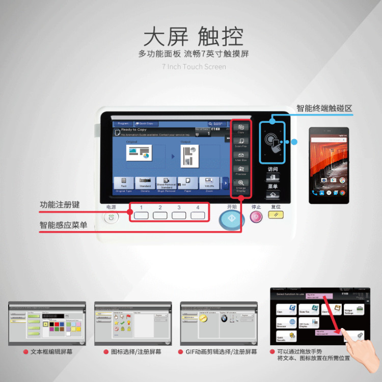 主菜单上非常人性化的添加了“卡片复印”按键,用户通过一键式操作,即可轻松的将身份证或银行卡等正反面同时复印到同一页面上。