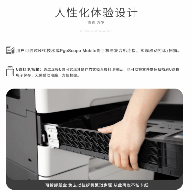 标配的纸盒采用了全新的可拆卸设计,免去以往拆卸纸盒的繁琐步骤。