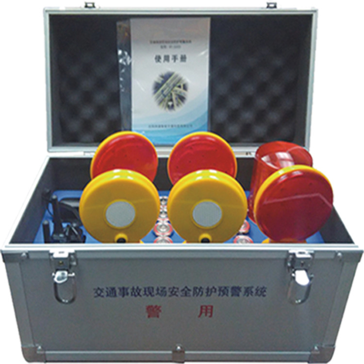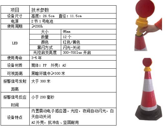 由微功耗计算机处理器控制,包含智能控制模块、无线网络模块,警示模块、电源管理模块、超距离闪光反射光源模块、光线感应控制模块组成。安装在交通事故现场防护使用的锥桶之上。前端检测预警设备通常每5个为一组,也可任意添加,无需人工自动无线组网,内置微型运动传感器,发出报警信号时间小于200ms,超低功耗运行,省电节能,防雨设计,主要材质为ABS,独特的镜面凹凸设计,可以更好的反射光源,使能见面更广。外形设计及制作材料使其具备一定的路面抗摔抗撞能力。内含红色闪灯,电源为干电池,无需充电工作时间超长,独特感光设计,日间工作光线良好自动断电,更好的节约电池电能,夜间或光线不足时自动开启闪灯,提高预警效果,减少现场操作环节。