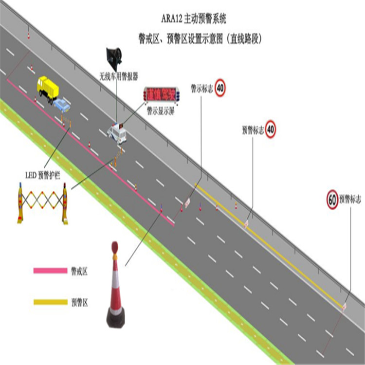 “交通事故现场预警系统”由前端检测预警设备、便携式报警器、车载报警灯三部分组成: