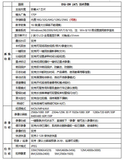 DSJ-N9单警执法视音频记录仪,蕴含多项最新视音频处理技术,功能全面,性能可靠,具有自主知识产权,外观专利权等。不但有传统的数码摄像,拍照,录音以外,还新增了激光定位,白光照明,红外辅助等功能,在外观上设计了双块可更换电池,配备底座可同时充电,选配车载支架可当行车记录仪使用等,可广泛用于公、检、法、司、武警、工商、税务等执法部门。执法者在执法现场使用该设备可适时记录现场情况,收集证据,规范现场执法行为,再现现场画面,保证执法准确性,公正性。