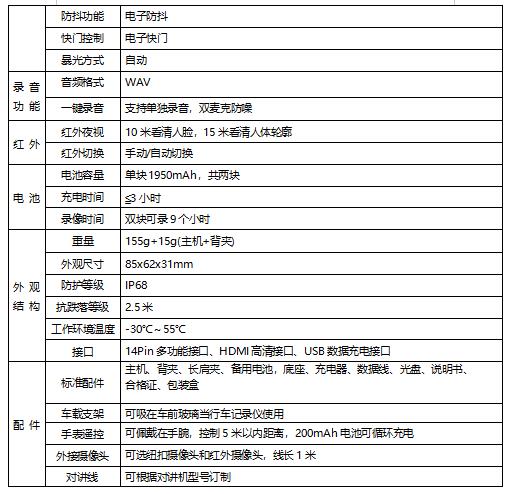 双块电池充满可连续录像9小时,单块电池充电时间小于3小时;