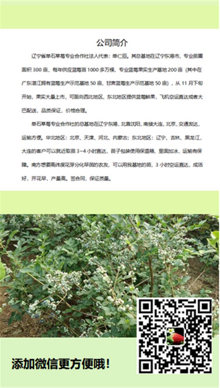 单石草莓专业合作社的总基地在辽宁东港,北靠沈阳,南接大连、北京,交通发达,运输方便。华北地区:北京、天津、河北、内蒙古;东北地区:辽宁、吉林、黑龙江,大连的客户可以就近取苗3~4小时直达,苗子包装使用保温箱,里面加冰,运输有保障。南方想要高纬度花芽分化早苗的农友,可以用我基地的苗,3小时空运直达,成活好,开花早,产量高。签合同,保证质量。