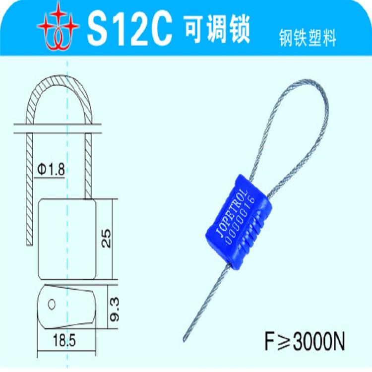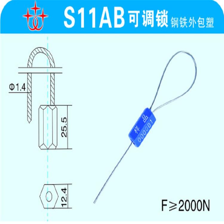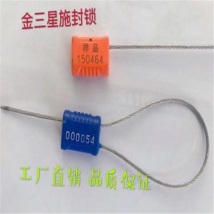 施封锁采用多条钢丝,能够几次使用,起到了既安全又经济实惠的作用,大大降低了用户的成本,锁体采用金属制成,锁体采用钢珠斜拉结构,外包ABS塑料,颜色有红、绿、兰三种颜色,也可根据顾客要求制成其他颜色,锁体表面采用热烫、冲压、激光打印条码、标志、编码。钢丝绳直径φ1.8长度可根据客户要求的订制,施封长度任意调节。拉力可达F≥200KG。