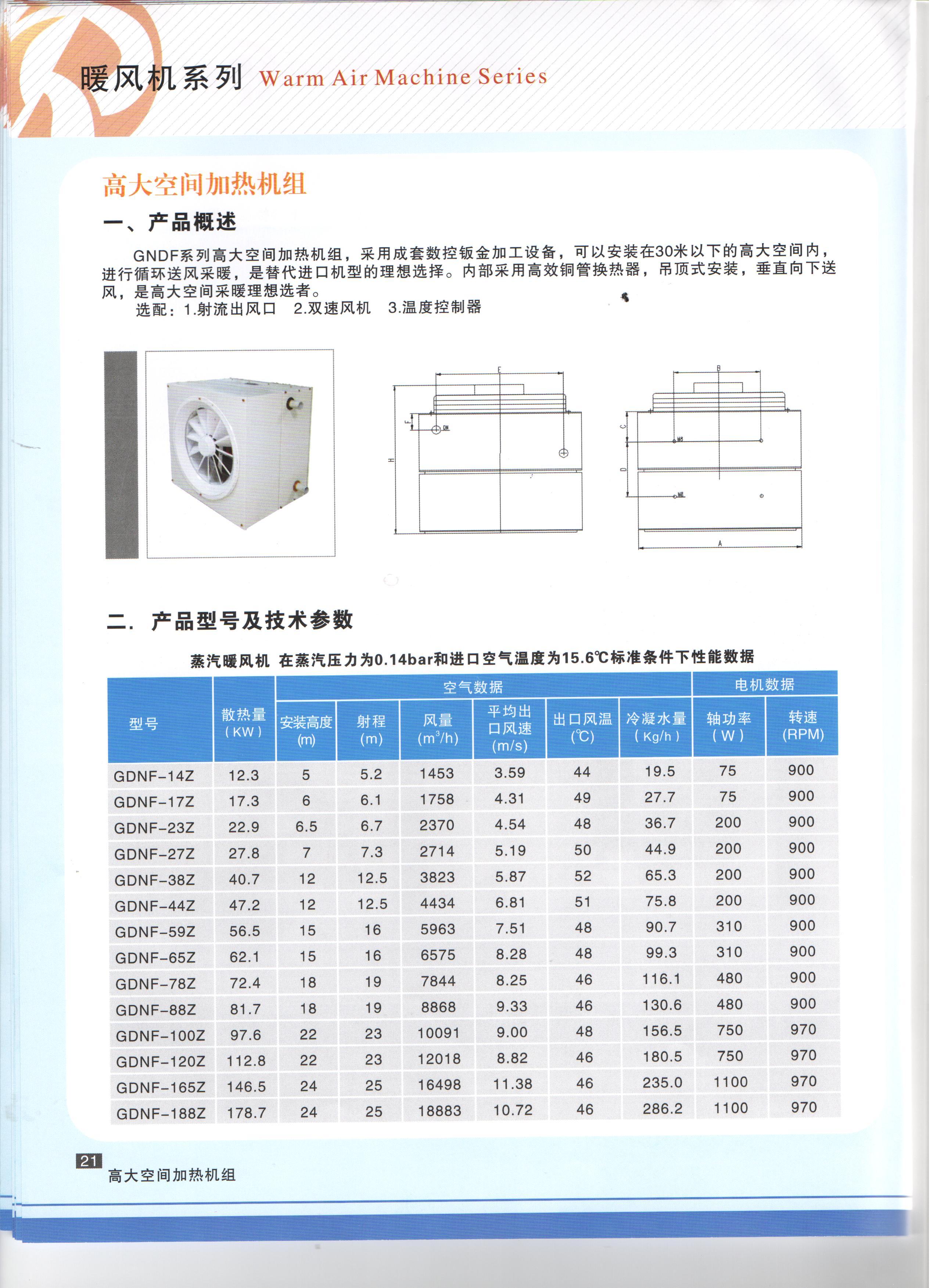 GNDF系列高大空间加热机组,采用成套数控钣金加工设备,可以安装有30米以下的高大空间内,进行循环送风采暖,是替代进口机型的理想选择。内部采用高效铜管换热器,吊顶式安装,垂直向下送风,是高大空间采暖理想选择。