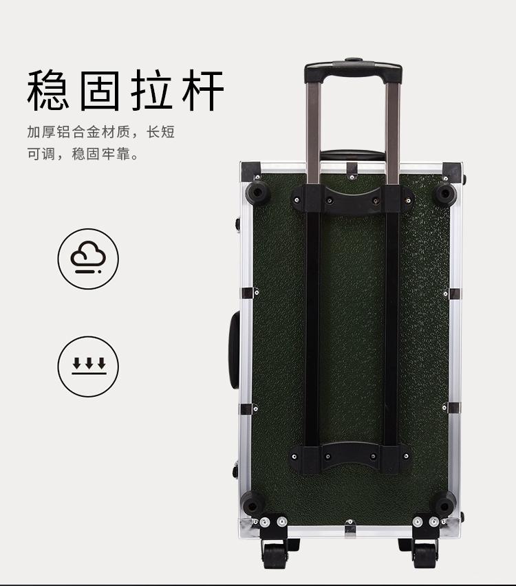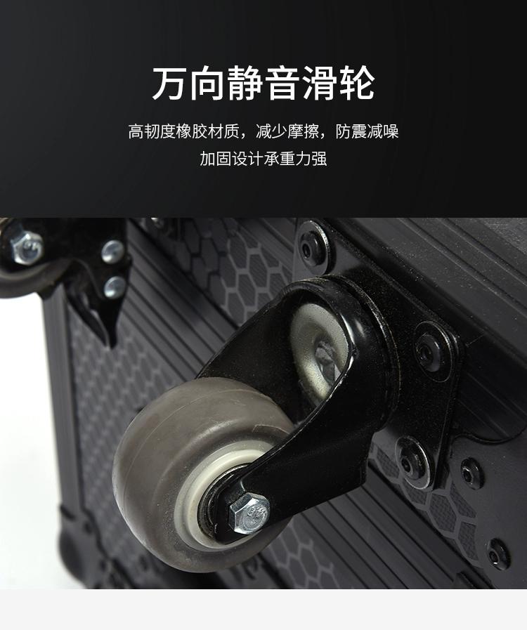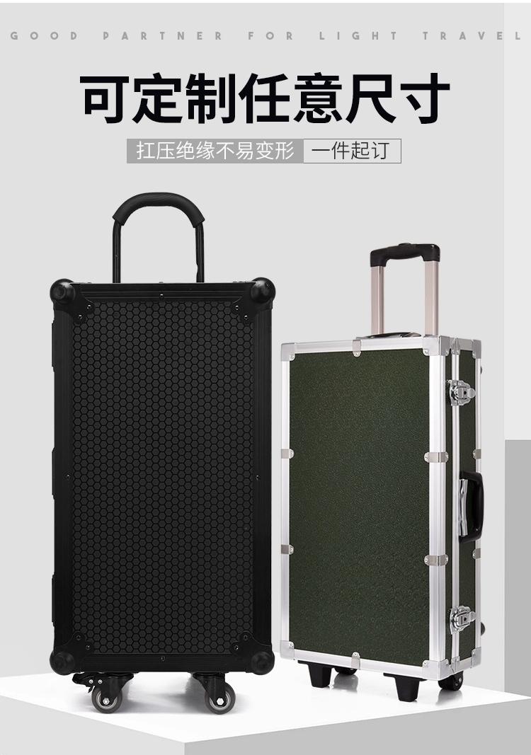 铝合金材料的航空箱具有高强度的保护功能,航空箱的外部结构:由较坚硬的多层EVA夹板外贴ABS防火板钉成木箱,EVA板材的各边采用一定厚度和强度的铝合金型材,箱体每一个角用高强度的金属球形包角与合金铝边和夹板连接固定,箱体底部用承受能力和耐磨能力极强的PU万向轮组合而成;内部结构:箱体可以根据产品特点安装隔板,箱体内侧和隔板贴上比较柔软的EVA复合固体回力材料,该材料具有量轻、保温、防震、防潮、防燃、抗氧化、密封功能。航空箱的内外结构和材料决定了航空箱的防火、防水、防冲击、机动方便等优点尽显无遗,而防火板颜色的多样性在视觉上更显得美观。