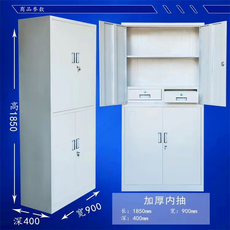 | 参数一 | 铁皮柜的类别:可分为文件柜、档案柜、更衣柜、鞋柜及各式储物柜 | 参数二 | 铁皮文件柜制造的主要工具:剪板机、折板机、冲压机、酸碱池、焊机、静电喷塑机 |