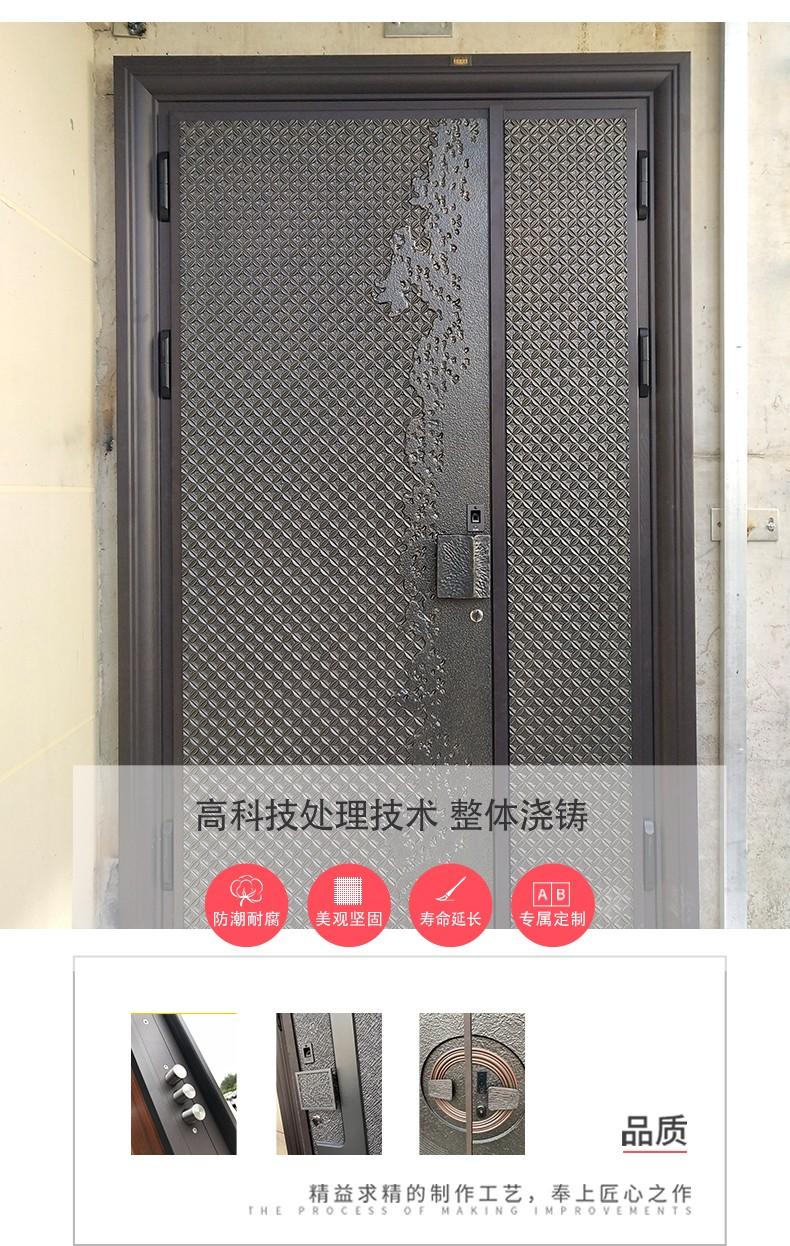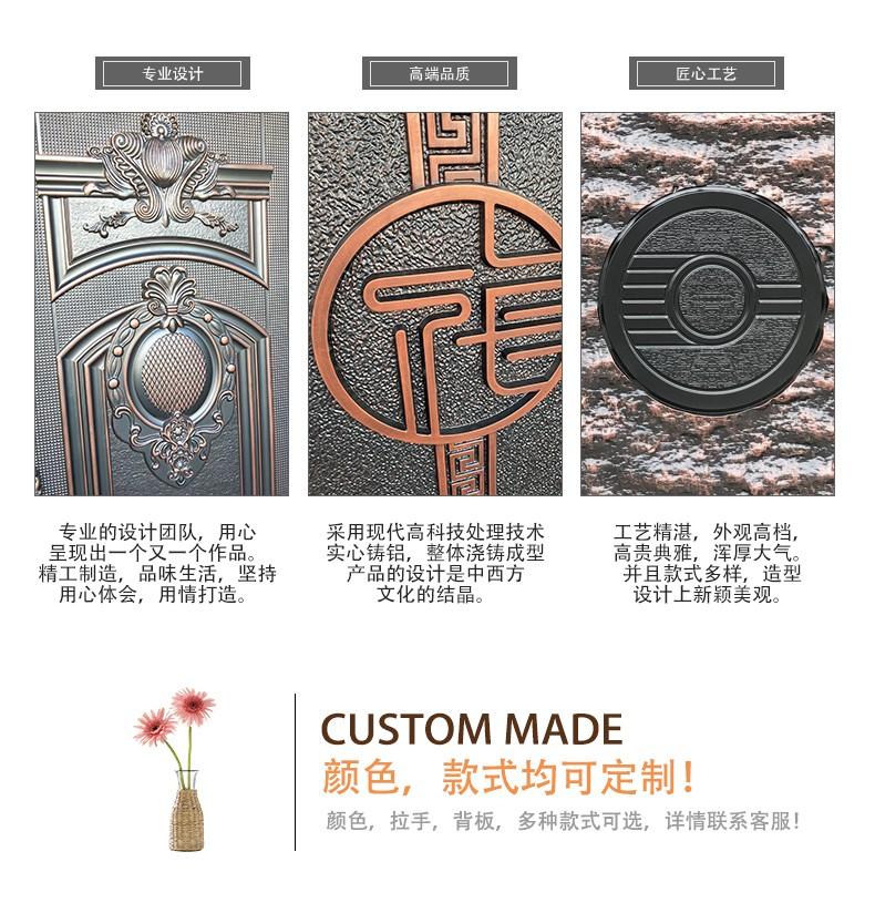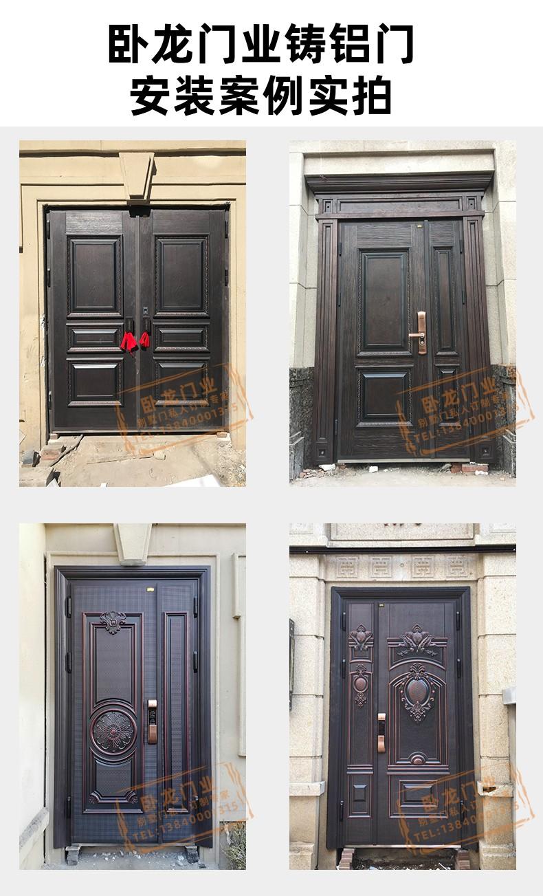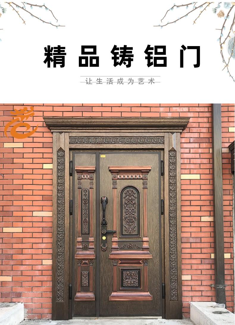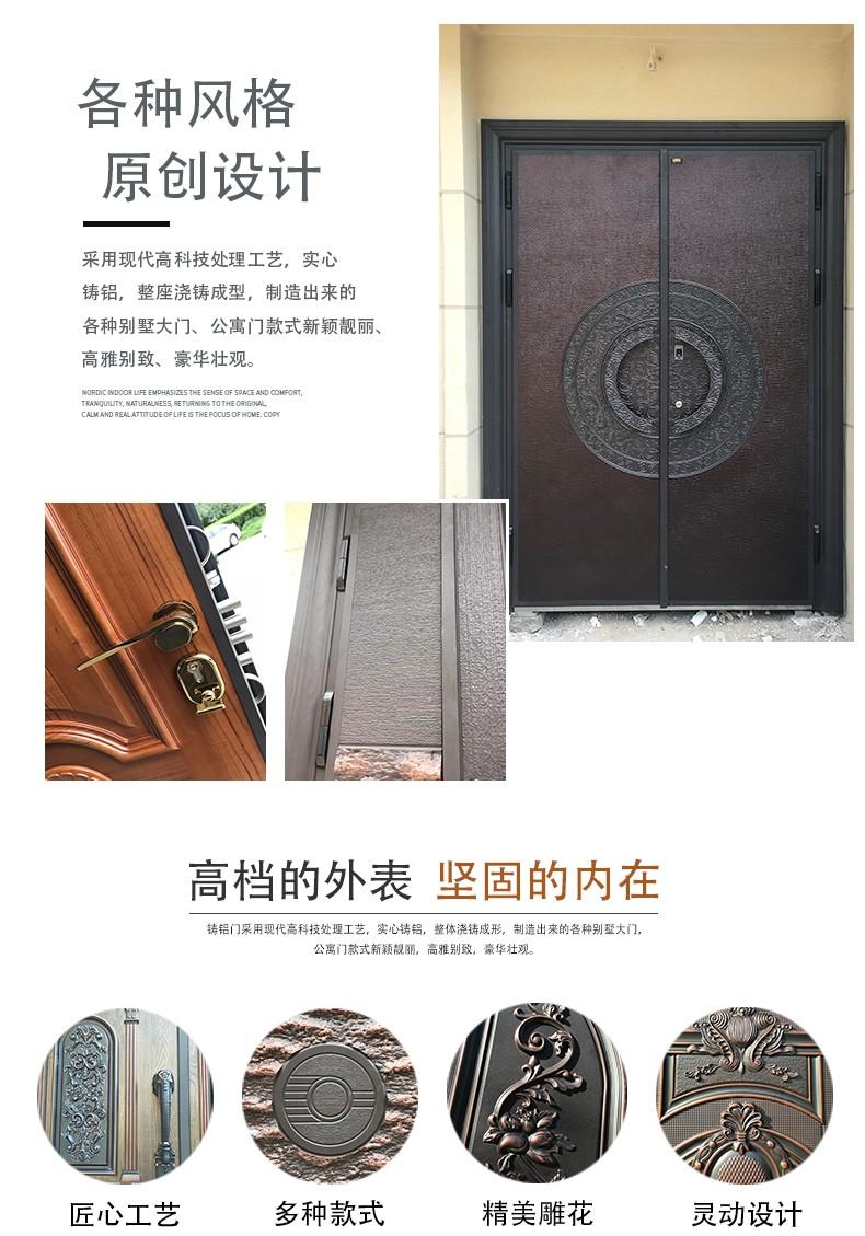 铸铝门是采用现代高科技处理工艺,实心铸铝,整座浇铸成型,制造出来的各种别墅大门、公寓门款式新颖靓丽、高雅别致、豪华壮观。产品的设计是中西方文化的结晶,并结合电动、智能、感应为一体,结合采用静电粉末喷涂机氟碳涂料,耐氧化、耐腐蚀、在沿海地带可做到长久保持不褪色,50年不生锈。在国内外广泛应用。铸铝门主要适用于别墅豪宅、高档公寓、花园别墅、房地产、超五星级酒店、住宅区、工业类厂房、物流仓储、市政工程