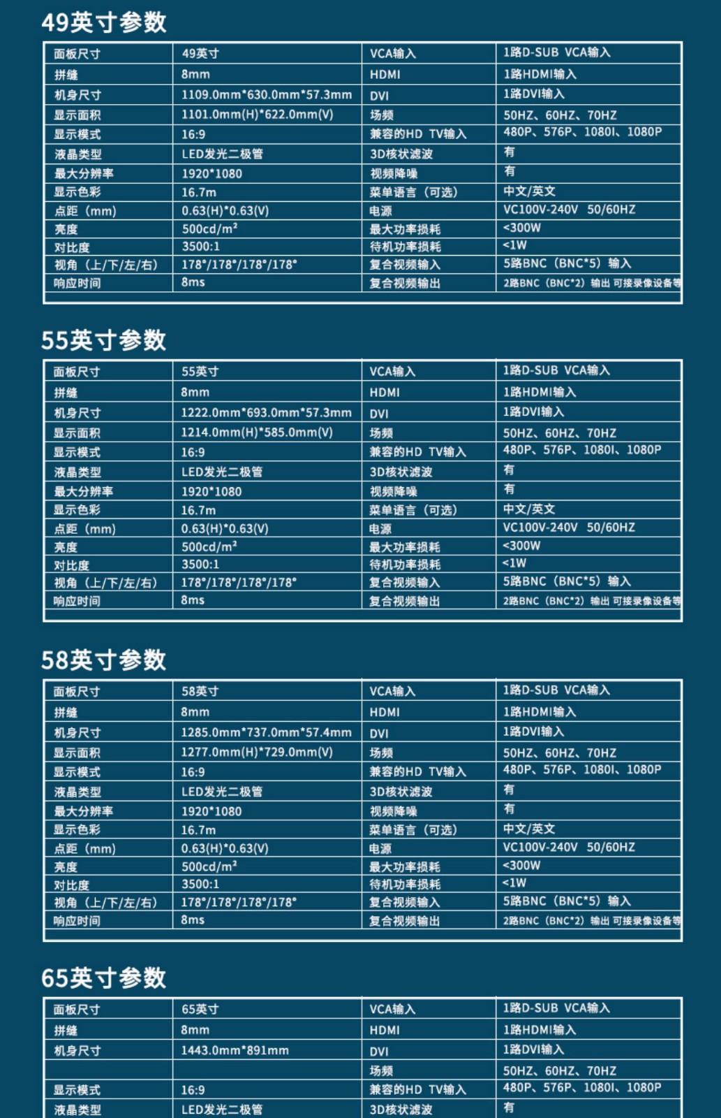 | 屏幕尺寸 | 46寸 49寸 55寸 65寸 | 屏幕比例 | 16:9 |