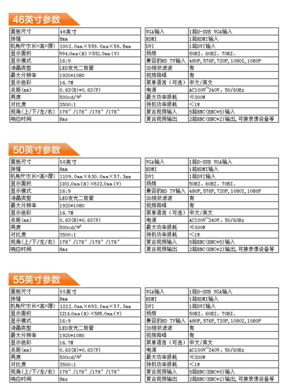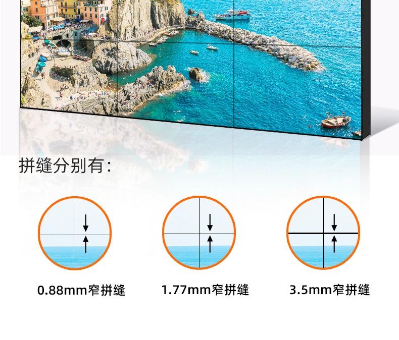 | 尺寸 | 55寸/46寸/65寸 | 物理拼缝 | 3.5mm/0.88mm/1.7mm |