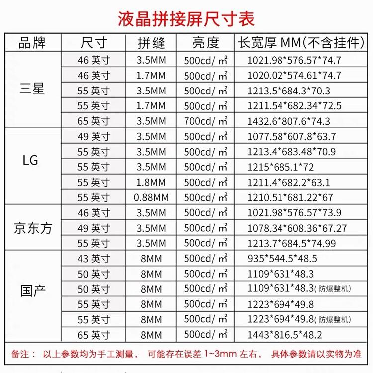 | 亮度调节方式 | 手动 自动 远程 | 用途 | 企业宣传 监控室 交通 等 |