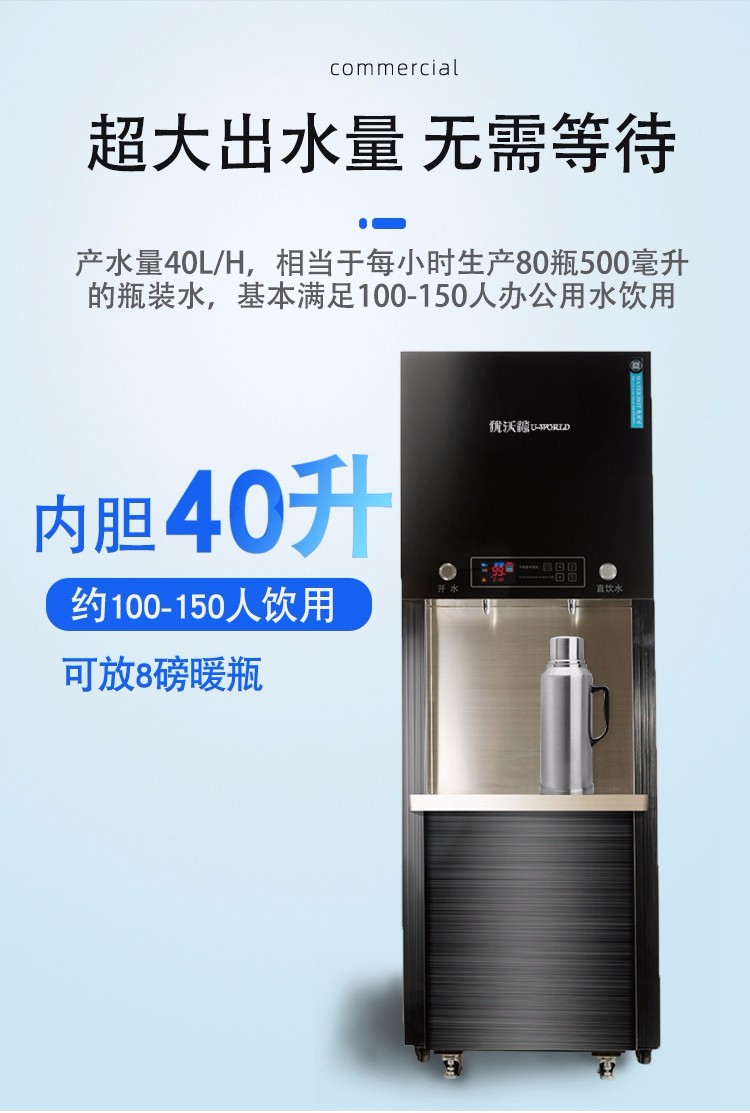 本产品能耗低,出水量可满足大流量饮水人群的集中需求,是军队、学校、医院、大型企业、机关、事业等单位饮用水解决方案,也是办公楼、写字楼、公共设施等饮用水改造的不二之选。