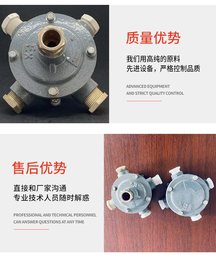 接线箱现有三种规格:内装螺旋自锁式接线端子规格有2.5-3.5平方毫米,将引入导线固定连接。不同型号规格的电缆密封套满足不同的电缆引入:塑制电缆密封套入口(安装端)是公制螺纹,内设防松夹爪,具有良好的机械特征。未使用的电缆入口可用空塞堵头密封,为今后更加便捷的设施进行改型与扩展。