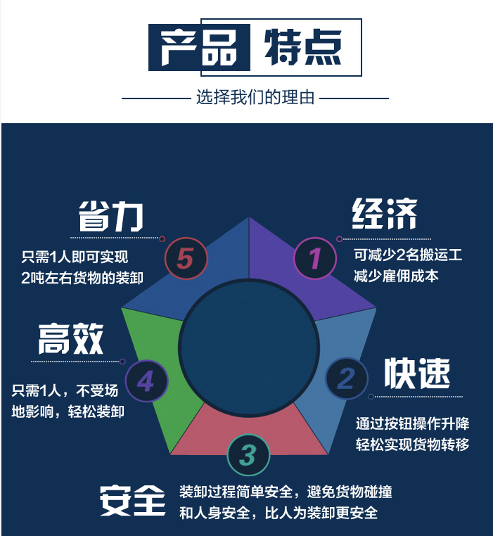 省力:货物基本以卡板、桶为载体,只需一人即可实现货物轻松装卸,大大减少了劳动强度,使装卸更具人性化。