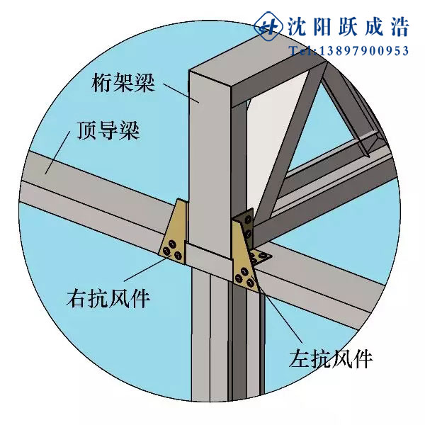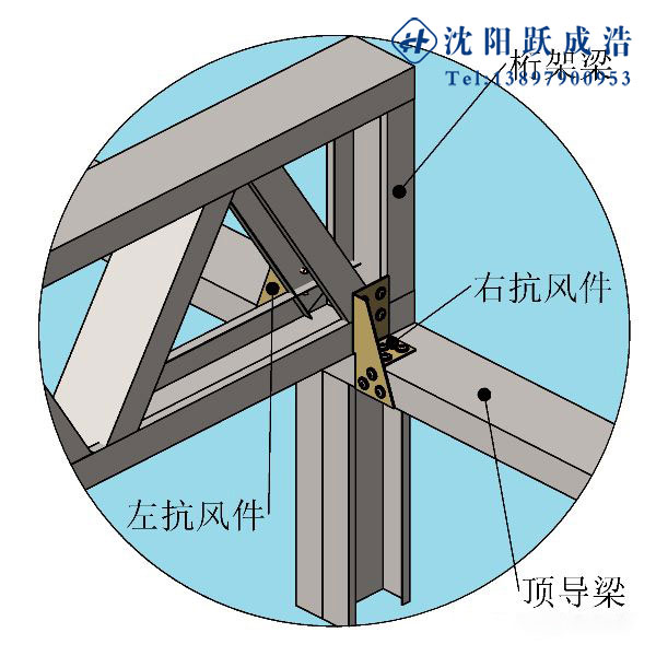 2)屋盖桁架梁与顶导梁的连接,防止屋盖桁架梁在风力作用下左右摇摆。