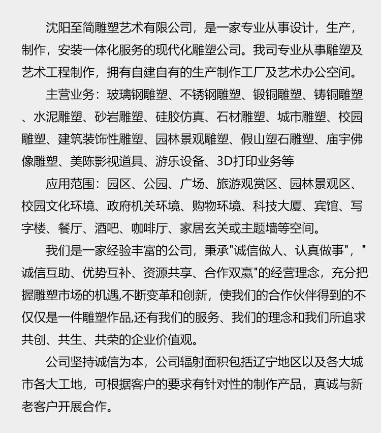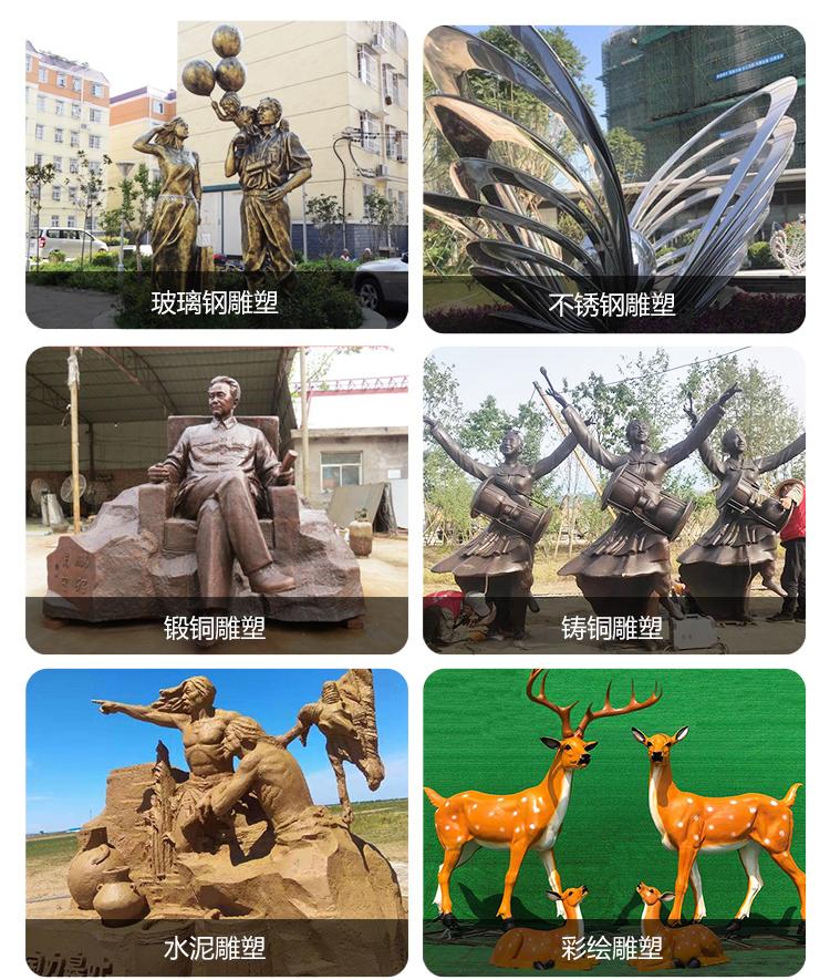 主营:玻璃钢雕塑、不锈钢雕塑、锻铜雕塑、铸铜雕塑、水泥雕塑、砂岩雕塑、硅胶仿真、石材雕塑、城市雕塑、校园雕
