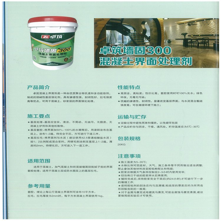 卓筑混凝土界面剂是一种由优质聚合物乳液和多功能助剂,制成的弱碱性基层强化剂。具有渗透性强、封闭性好、拉毛强度高等优点,可用于混凝土、砂浆层的界面强化处理。