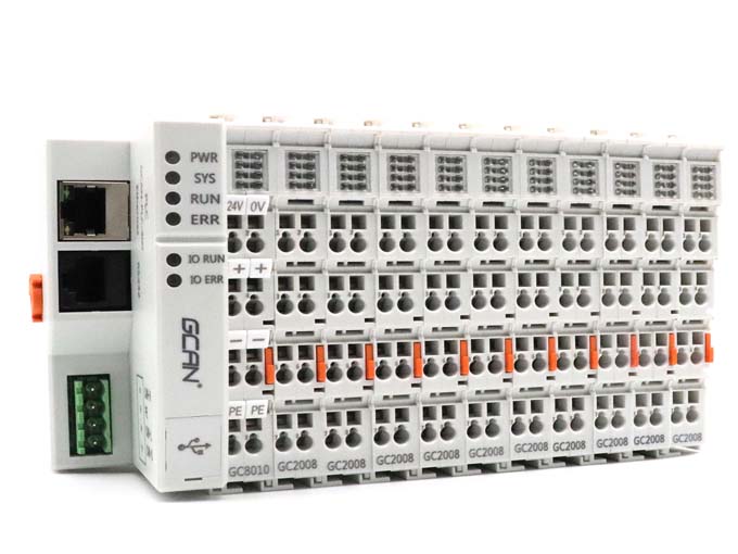 广成科技小型可扩展PLC模块由一个可编程的主控模块(GCAN-PLC-400)、若干I/O模块以及一个终端端子模块组成,主控模块使用高速CPU,具有强大的运算及处理能力。主控模块还具有多种现场总线通信接口,用户可以使用这些通信总线接入对应的网络与其他设备进行通信。
